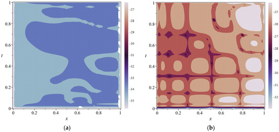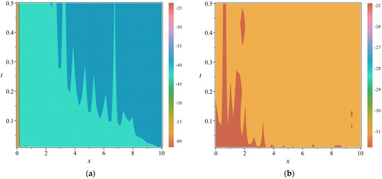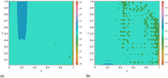 Graphical representations of error indicators for Problem 2 with the specified parameters . (a) Logarithmic plot of the absolute error function: (b) Logarithmic plot of the absolute residual function: .