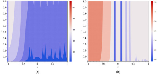 Graphical representations of error indicators for Problem 4 with the specified parameters . (a) Logarithmic plot of the absolute error function: (b) Logarithmic plot of the absolute residual function: .