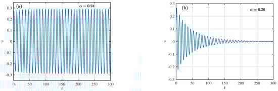 By using Matlab, Equation (23) has the root . Figure 1 is the time history of the action potential u. As , the action potential u is periodic spiking; while , the action potential u convergences to the quiescent state. These numerical results are consistent with the third conclusion shown in Theorem 1.