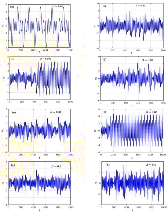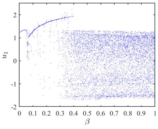 As shown in Section 3.2, model (13) is unstable for all . In this case, periodic spiking and chaotic spiking occur in model (13). Figure 2 is the bifurcation diagram of the local maxima of the variable . It is found that model (13) changes between the periodic spiking and the chaotic spiking as increases from 0 to 0.4. While , model (13) goes into chaotic spiking. Figure 3 is the time history of state for different values. There is periodic spiking when , , and , and then there is chaotic spiking when , , , , and . This implies that model (13) shows that tangent bifurcation increased from 0 to 0.4 and shows only chaotic spiking when .