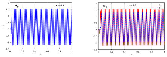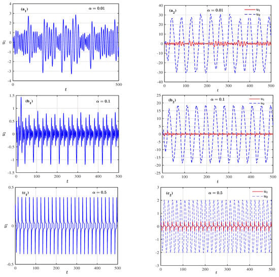 When and , model (13) is chaotic (Figure 4a1,b1). When or , model (13) goes into periodic spiking (Figure 4c1,d1), and it is found that the frequency of the oscillation increases as the order increases. This implies that the learning frequency of tabu learning neurons is very high when the memory decay rate is high. In theory, this is quite consistent with the actual phenomenon. In addition, when the memory decay rate increased from 0.01 to 0.9, Figure 4a2,b2,c2,d2 show that model (13) enters frequency synchronization firstly and then the amplitudes of two neurons gradually become consistent. This implies that the memory decay rate has a significant impact on the synchronization of the neurons connected by model (13).