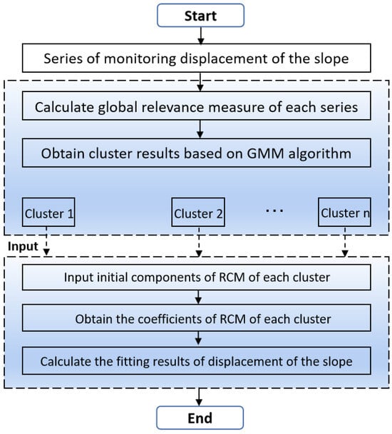 In this section, to consider the correlations among monitoring points, we developed the prediction model based on the random coefficient model (RCM) and Gaussian mixture model (GMM) under the frame of panel data analysis. As the first step, we classified the monitoring points into several groups according to the data characteristics using the Gaussian mixture model, in order to take the temporal-spatial characteristics of monitoring points into account. With the clustering results, we established the random coefficient model for each data group. Specifically, as the stability of slope near water areas is affected by the fluctuation of water level, the reservoir water level was selected as an explanatory variable in the proposed model. The flow chart of the proposed model for predicting the displacement of slope is shown in Figure 1.