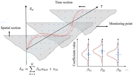 For the panel data analysis, the dataset can be considered as a three dimensional dataset, which contains a time series and a data panel. Figure 2 illustrates the structure of a panel data model.The random coefficient panel data model (RCM) allows regression coefficients to vary across different individuals or entities. This model is particularly useful for panel data, which contains multiple observations over time for the same entities, capturing individual-specific effects. Equation (10) expresses a two dimensional panel regression model: