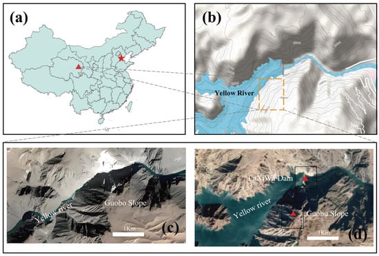 Geographical location of Guobu slope: (a) geographical location, (b) contour map, (c) distant view, (d) relative location between Guobu slope and Laxiwa dam.