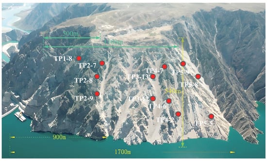 As the deforming slope is very close to the dam site (about 700 m from the dam) and has a large volume (about 700 m high and 1000 m wide in average), once the slope fails, the event will destroy the dam and the hydropower station. Also, the associated waves created by the induced landslide would flood the downstream area, and threaten people and constructions located downstream. Similar disasters had occurred in history; in 1993 in Vajont, Italy, failure of the left bank slope of the Vajont reservoir over-topped the dam and caused more than 2000 casualties downstream []. According to the characteristics of the slope surface, previous research has estimated that the total volume of potentially unstable mass can be 120 to 150 Mm3; that is, about one half of that of the Vajont landslide [].