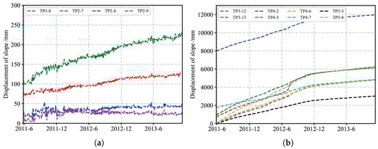 Time variation of monitored slope displacement at (a) monitoring points TP1-8, TP2-7, TP2-8, TP2-9 and (b) monitoring points TP3-12, TP3-13, TP4-2, TP4-5, TP4-6, TP4-7, TP5-5, TP5-8.