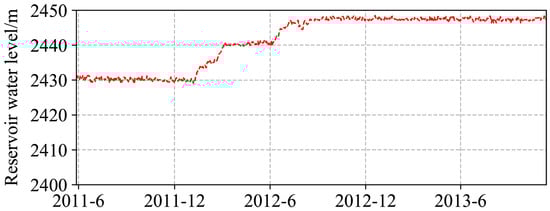 Figure 6 shows the time variation of the water level in the reservoir. The water level was relatively stable during two periods: the water level fluted around 2430 m during June 2011 to December 2011; and the water level fluted around 2445 m during August 2012 to November 2013. The water level increased gradually from 2430 m to 2445 m from December 2011 to August 2013. In addition, it can be seen from Figure 5 that the displacements at most monitoring points during the water filling period were more significant than the period with stable water level, which verified the necessity of considering the variation of water level in the model development.