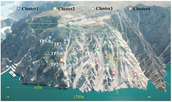 We first classified the monitoring points into several groups according to the characteristics of monitoring data using the Gaussian mixture model, and then modeled the displacement of monitoring points at each group using the random coefficient model. Figure 7 shows the clustering results of the monitoring points using the Gaussian mixture model. The scale of the picture is marked by the yellow line at the bottom of the figure. Mathematical details of the clustering methods have been presented in Section 2.1. The 12 monitoring points are classified into four groups, based on similarities of characteristics of data sequence: cluster 1 contains TP1-8, TP2-7, and TP2-8; cluster 2 contains TP2-9; cluster 3 contains TP3-12, TP4-2, and TP5-5; cluster 4 contains TP3-13, TP4-6, TP4-7, TP5-8, and TP5-9.