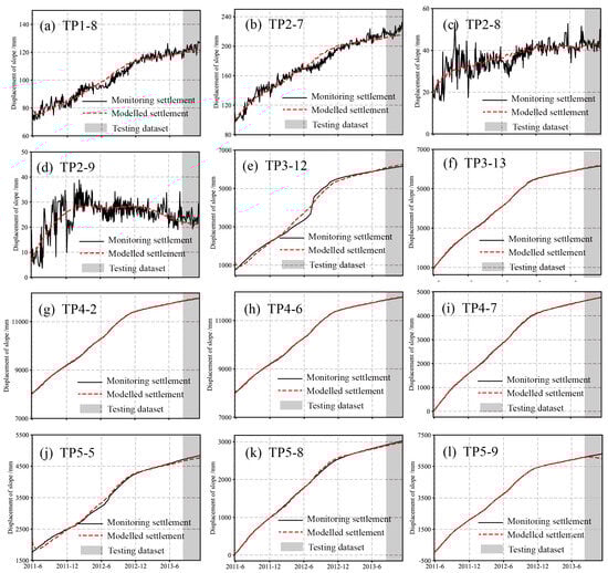 Figure 8 displays the monitored and modeled displacement of the slope for each monitoring point. The black solid line represents the monitoring data, and the red dashed line denotes the modeled dataset. The test dataset is highlighted by the gray area in the figures. For monitoring points TP3-12, TP3-13, TP4-2, TP4-6, TP4-7, TP5-5, TP5-8, and TP5-9, the time evolution of monitoring data varies smoothly, and the modeled data fits quite well with the monitoring data. For monitoring points TP1-8, TP2-7, TP2-8 and TP2-9, the time evolution of monitoring data has significant fluctuations, the modeled data generally fits the midline of monitoring data.
