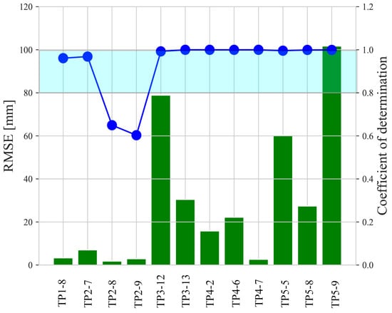 where denotes the monitored data of the training dataset, where i counts the series number of the training dataset, is the average of the monitored data of the training dataset, denotes the modeled data of the training dataset, and N counts the total number of data in the training dataset. It can be seen from the figure that the coefficients of determination of most monitoring points are higher than 0.9 and close to 1, which represents a fairly good prediction accuracy. However, the coefficients of determination of monitoring points TP2-8 and TP2-9 are significant lower than those of other monitoring points. The root mean square error (RMSE) represents the derivation between the estimator and the observer of the testing dataset, whose expression can be written as: