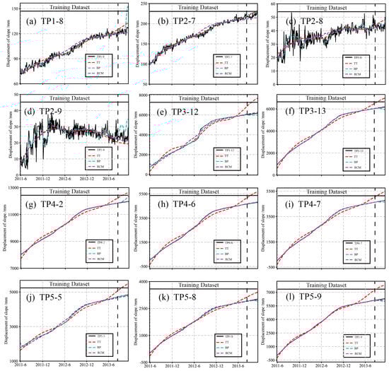 The predicted displacement of slope determined by TT, BP and RCM for each monitoring point: (a) TP1-8, (b) TP2-7, (c) TP2-8, (d) TP2-9, (e) TP3-12, (f) TP3-13, (g) TP4-2, (h) TP4-6, (i) TP4-7, (j) TP5-5, (k) TP5-8, (l) TP5-9.