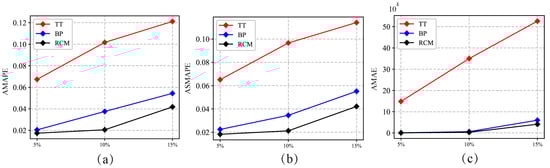 To further estimate the prediction abilities of these three models, we selected 5%, 10%, and 15% of the dataset as test data, and calculated the error indicators of the prediction ability under different prediction length. The error indicators used here include: the average of mean square error (AMSE), the symmetric mean absolute percentage error (ASMAPE), and the mean absolute percentage error (AMAPE) of the prediction results of all monitoring points. The expressions of AMSE, ASMAPE, and AMAPE are as follows:
