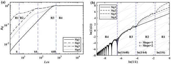 Figure 2a approximately marks three blue dashed lines parallel to the y-axis based on the corner positions with scales of 6, 64, and 640. The horizontal coordinates are divided into four regions, R1~R4. The corner is located at the intersection of the Rq−Len curve with the vertical dashed line. The frequency component is associated with the corner. Figure 2b shows a similar phenomenon. The frequency and scale correspond with each other, as shown below.