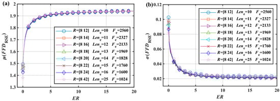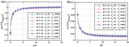 Based on the fixed interval parameters in Figure 4, Figure 5, Figure 6, Figure 7 and Figure 8 and Equations (4)–(9), the results of and were calculated according to Figure 3, and their characteristics were analyzed later on. The and characteristic curves in Figure 4 highly overlap, proving that the specified can evaluate the corresponding . The characteristic curves in Figure 4a are not close to overlapping because is a constant value. This means that there is a definite relationship between the FFD (calculated from Equations (13) and (14)) and ER. The curve in Figure 4a is named the FC-Curve in this paper, taking the following form.