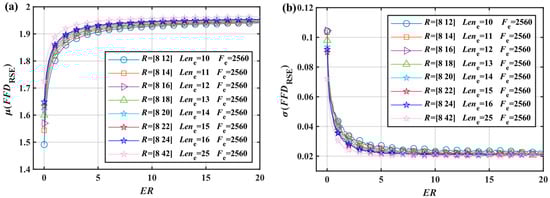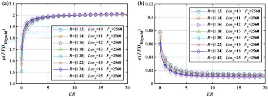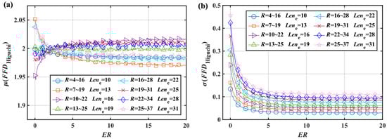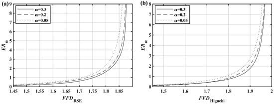 The was analyzed following the same process yielded in Figure 10b. The rapidly increased when , indicating a substantial decrease in the sensitivity of the . The exact size of the could not be reliably estimated when . The upper limit of the sensitivity range with the curve of was determined, resulting in , , and . When , the was almost constant and the could not estimate how small the was; thus, and . Therefore, the sensitivity range of the was . To summarize, beyond this range but less than 2, the FFD cannot reliably estimate the ER size and completely loses its distinguishing ability, but can represent the relative size. The sensitivity range is also a property of the FD, which is why the FD cannot analyze signals with a large ER.