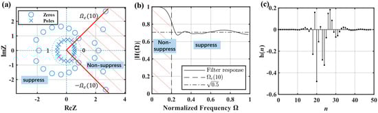 Take the design of Filter6 shown in Table 2 as an example. The designed HSF suppresses the frequency components after ( before normalization), as shown in the ‘suppress’ section of Figure 11a,b. The frequency before is guaranteed to pass as losslessly as possible, as shown in the ‘non-suppress’ section of Figure 11a,b. By arranging the zeros and poles as in Figure 11a, the normalized frequency response of Figure 11b is thus obtained. Located in the 0~0.2 before , the response is as close to 1 as possible, while located in 0.2~1, the frequency domain is suppressed by a factor of . Figure 11c is the unit sampling response , which can be used to obtain filtered result according to Equation (23).