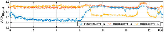 A problem with the FD in engineering applications is the inability to analyze signals with an excessive ER. The FD has good applicability for two types of signals, including smaller ER signals such as microseismic monitoring events [], bioelectrical signals [,,,,], wear and aging signals [,,], and so on. Additionally, the ER differs between different signals, such as heartbeat signals [], cough signals [], and short-circuit fault signals []. However, the FD cannot distinguish between two states with a large ER, such as in milling chatter detection [] and extracting fatigue driving from voice signals []. The FD almost loses its distinguishing ability when beyond the sensitivity range, e.g., fluctuating at around two. To solve this problem, most scholars have adopted signal denoising or signal reconstruction methods. Ji et al. [,] reconstructed a signal from key sub-signals after decomposition and then calculated its FD to identify the milling chatter. Zhuo et al. [] carried out wavelet denoising and then identified the milling chatter of thin-walled blades via the FD. Sharma et al. [] applied an analytic time–frequency flexible wavelet transform to filter EEG signals and calculate the FD to identify epilepsy. Smooth multi-scale morphological filtering [] improves the FD’s capabilities by individually filtering at different scales. In addition, a low-pass filter or bandpass filter [,,] can effectively reduce noise. However, it is unsuitable for signals with a wide frequency-domain distribution. In this study, a high-frequency suppression filter (HSF) is proposed, designed to suppress high-frequency energy and the ER within the FD’s sensitivity range, providing a new option to expand the FD’s applicability.