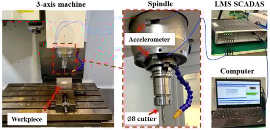 The milling experiments were performed with a 3-axis machine tool. The workpiece material was Al7075, and the size was 150 × 85 × 8 mm. A vise was used to clamp the workpiece, which extended to 45 mm. The size of the vise was 150 mm wide and 40 mm deep. The cutter parameters are shown in Table 4. Acceleration sensors were generally arranged close to the machining area, such as on the workpiece or spindle housing [,].