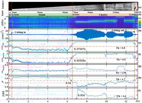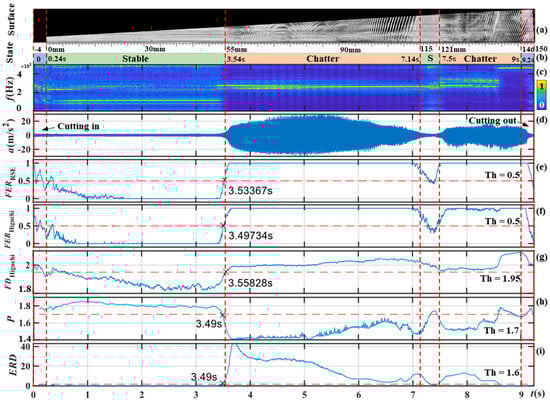The results of s1 are shown in Figure 18, where the red vertical dashed lines represent the correspondence between (a) surface features, (b) state labels, (c) STFT, (d) time domain signals, and (e~i) the calculated results. The ‘×’ symbol represents the time to recognize chatter and (b) is the milling state determined based on (a) and (c). The first and last 4 mm in (a) stand for cutting in and out, respectively. Since needed to set the chatter interval, it failed to recognize the chatter of 4000 Hz~5000 Hz after 8.7 s. The frequency distribution of some chatter states was more uniform. Therefore, also failed to identify the chatter in 8.7 s. and produced some mistakes in the cut-in process.