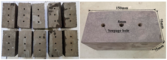 The carbonaceous-shale specimen (Figure 1) was taken from the Permian strata in southwestern China. The mineral composition is mainly clay minerals and calcite, which are composed of gravel debris, sand (particle) debris, and carbonaceous and muddy cementitious materials. The specimen size was 75 mm × 75 mm × 150 mm, and three cylindrical holes with a diameter of 8 mm × 37.5 mm were drilled at equal intervals on the top of the specimen. The unevenness error of the end face should not exceed 0.05 mm.