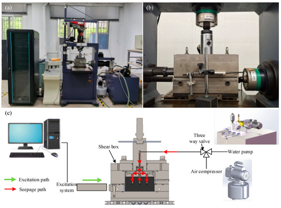 The soft-rock shear-creep test system with a simulation of coupled rainfall seepage and blasting vibrations was used for the experiment (Figure 2a). The specimen was placed in a shear box (Figure 2b). During the shearing process, the simulation of the rainfall dry–wet cycle and blasting vibration of the specimen can be achieved, which is more in line with engineering geological conditions of the carbonaceous-shale weak interlayer. The dry–wet cycle and vibration path are shown in Figure 2c.