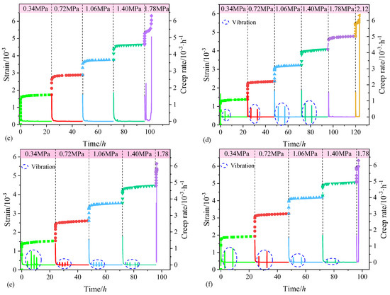 Creep curve of carbonaceous shale with different number of dry–wet cycles and blasting vibrations. (a) m = 0, n = 0. (b) m = 8, n = 0. (c) m = 16, n = 0. (d) m = 0, n = 24; (e) m = 0, n = 48; (f) m = 8, n = 24.