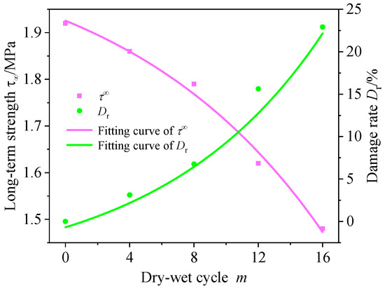 Rainfall dry–wet cycles and blasting vibrations both lead to varying degrees of damage to carbonaceous shale, manifested by different shear-creep characteristics. By comparing Figure 4a–c, it can be seen that as the number of dry–wet cycles increases, the creep deformation of the specimen gradually increases. When m = 0 or 8, the specimen fails under the sixth level of shear stress (Figure 4a,b). When m = 16, the specimen fails under the fifth level of shear stress (Figure 4c), indicating that as the number of dry–wet cycles increases, the shear stress level that the specimen can withstand decreases. Compared with m = 0, the long-term strength of the specimen with m = 8 and 16 decreased by 6.77% and 22.92%, respectively (Figure 5). The more dry–wet cycles there were, the greater the decrease in the long-term strength of the specimen. The number of dry–wet cycles showed an exponential negative correlation with long-term strength. As the number of dry–wet cycles increases, the deceleration creep time of the specimen increases. Taking the fourth level of shear stress as an example, the deceleration creep times of the specimens with m = 0, 8, and 16 are 0.57 h, 1.37 h, and 1.82 h, respectively. This indicates that dry–wet cycles cause mineral dissolution and internal structural damage in the specimens. Under stable shear stress loads, the time required for internal stress adjustment in the specimens increases with the number of dry–wet cycles.