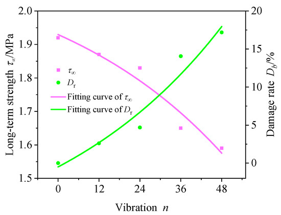 By comparing Figure 4a,d,e, it can be seen that as the number of vibrations increases, the creep deformation of the specimen gradually increases. When n = 0 or 24, the specimen failed under the sixth level of shear stress (Figure 4a,d). When n = 48, the specimen failed under the fifth level of shear stress (Figure 4e), indicating that as the vibration increases, the shear stress level that the specimen can withstand decreases. Compared with n = 0, the long-term strength of the specimen with n = 24 and 48 decreased by 4.68% and 17.19%, respectively (Figure 6). The more vibrations there were, the greater the decrease in the long-term strength of the specimen. There was an exponential negative correlation between vibration and long-term strength. As the number of vibrations increases, the deceleration creep time of the specimen increases. Taking the fourth level of shear stress as an example, the deceleration creep times of the specimens with n = 0, 24, and 48 are 0.57 h, 0.94 h, and 1.38 h, respectively. This indicates that vibration causes the shear off of mineral particles and the internal structure damage in the specimen. Under stable shear stress loads, the time required for adjusting the internal stress of the specimen increases with the increase in vibration times.