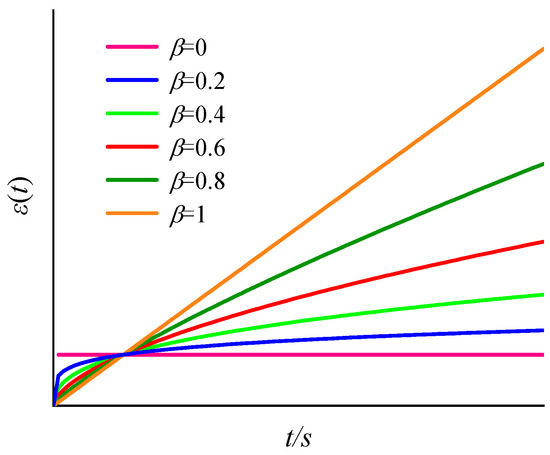 The creep strain curves of Abel dashpot with different values of fractional order β are shown in Figure 8. As shown in Figure 8, when β = 0, the strain remains constant, and the Abel dashpot exhibits an ideal elastic body. When β = 1, the strain increases linearly with time, and the Abel dashpot exhibits an ideal viscous body. When 0 < β < 1, the creep curve exhibits a nonlinear gradient process, and the Abel dashpot exhibits both elastic and viscous characteristics, which can be used to describe the viscoelastic deformation characteristics of the material between ideal elasticity and ideal viscosity.