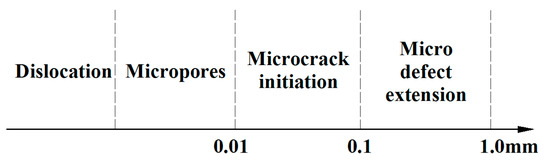 The field of damage mechanics mainly studies the propagation of micro defects (dislocation, micropores, microcrack, etc., as shown in Figure 11) and the mechanical properties of materials containing micro defects under the influence of the external environment and loads. The initiation and propagation of these micro defects can lead to a continuous deterioration of materials, resulting in damage [50]. Material damage will lead to a decrease in its physical and mechanical properties, such as elastic modulus, density, bulk density, etc.