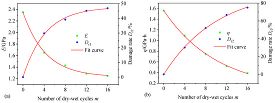 Relationship between parameter damage rate of carbonaceous shale and dry–wet cycle. (a) Instantaneous elastic modulus E and its damage rate. (b) Viscous coefficient η and its damage rate.
