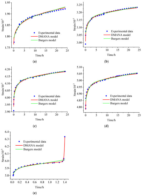 The Burgers model contains viscous elements, and the Kelvin model is also a type of viscoelastic body. The Abel dashpot (0 < β < 1) can also be used to describe the viscoelasticity of materials and has only one element, which is simpler in structure compared to the Burgers model. Therefore, an improved Burgers model was obtained by replacing the viscous element and Kelvin model in the Burgers model with the Abel dashpot (Figure 10b).