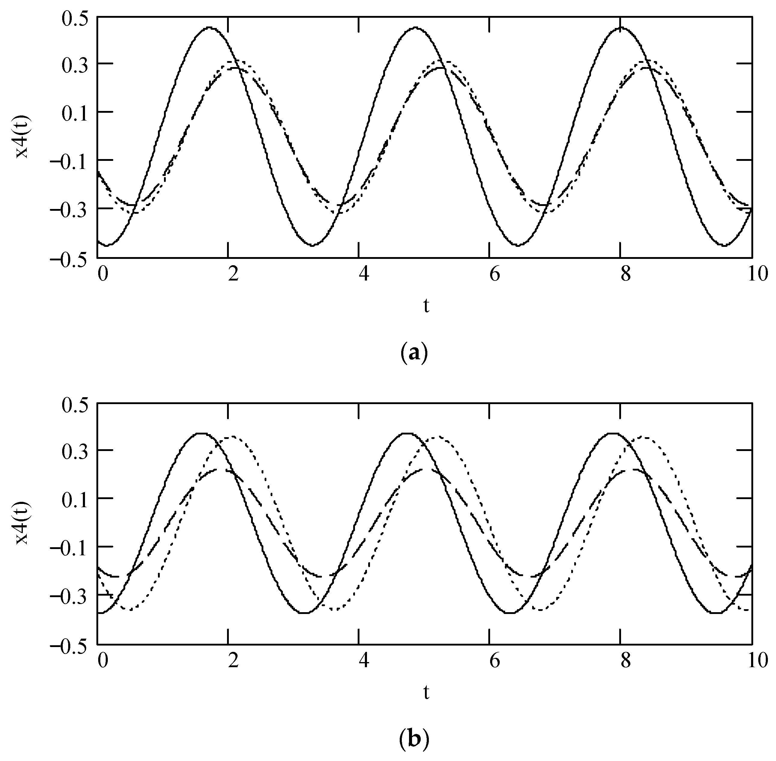 6.3. Stationary Response to Sinusoidal Vibration of Class IV Fractional Vibrator