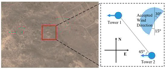 Location and layout of the instruments (left panel from Google Maps); blue circles denote 2 observation towers, arrows mark orientation of sensors, and sector shows direction range of accepted data.