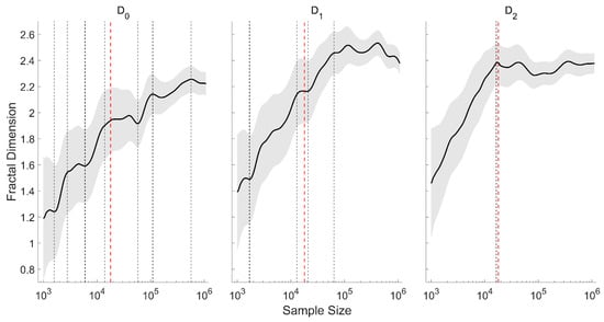 The relationship among the sample size and the fractal dimensions of different orders for 20 random cases. The black dashed lines mark the stages of the increased dimensions, the red dashed line denotes the sample size chosen in this study, and the gray area denotes the standard deviation.