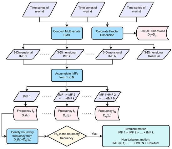 The method of Hilbert–Huang transform, recognized for its proficiency in managing non-linear and non-stationary signals with multiple components [,,], proves particularly effective when applied to atmospheric turbulence data. This study leverages this method to distinguish between turbulent and non-turbulent components within the observational data. The fundamental steps of the Hilbert–Huang transform are as follows:
