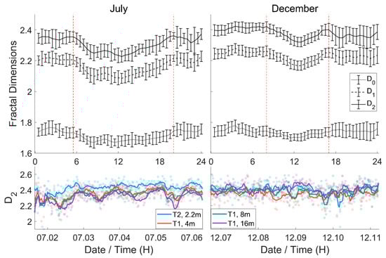 Atmospheric turbulence is worth exploring through multifractal properties for its time–space chaotic nature. The arbitrary order of a fractal dimension has been proved able to be directly calculated from the time series of observational data [,], which follows: