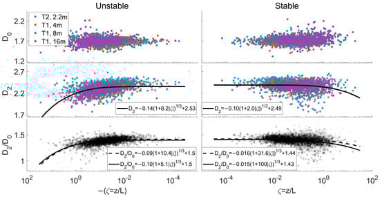 On one hand, the different orders of fractal dimensions can be taken into account in exploring new aspects of similarity relationships. It is tested that the ratio of 2nd and 0th orders fractal dimensions with respect to stability parameters shows a steady “1/3” exponential decreasing law, which can serve as the measure of multifractality. The multiplication of this ratio is demonstrated to be effective for both normalized standard deviation and cross-correlation coefficients. This enhances their distinguishability for different properties and increases their tolerance for errors, thereby reflecting the conditions of a broader range of atmospheric stratifications. It is conceivable that scalars, such as temperature and gas density, could also be considered as independent dimensions in the calculation of the fractal dimension. This holds the potential for further practical applications of fractal properties.