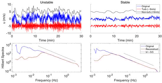 Figure 11 offers a comparative analysis of the time series and Hilbert spectra between the original and reconstructed u-wind in both stable and unstable cases. The time series elucidates that under stable stratification, both turbulent and non-turbulent motions exhibit mild behavior, with the amplitude of turbulent motion demonstrating significant variability. Conversely, under unstable stratification, both types of motions are more intense, characterized by larger average amplitudes and frequencies. In both scenarios, the non-turbulent motion significantly influences the shape of the time series. However, the boundary frequency in stable stratification tends to be smaller, indicative of the slow-changing features of non-turbulent motions. The Hilbert spectra reveals, from the energy point of view, that the non-turbulent motions of larger scales are eliminated, but there are still low-frequency components persisting. This is because the frequencies of IMFs are dynamic and time-dependent, and therefore reconstructing turbulence data by eliminating low-frequency IMFs will not result in a truncation in spectra like the filtering in Fourier spectra. The remaining low-frequency components share the same scale and dynamical properties as the motions in the sub-inertial range and thus do not disrupt the self-similarity characteristics of atmospheric turbulence.