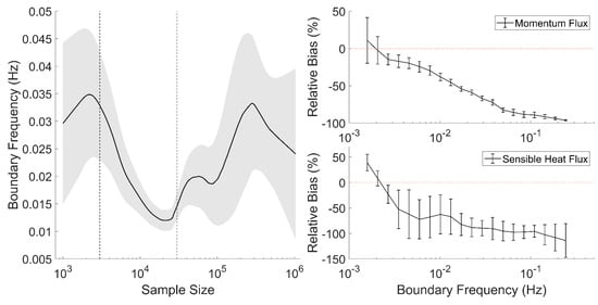 Relationship between boundary frequency and the sample size (left) and the correction of turbulent momentum and sensible heat flux with respect to boundary frequency (right). The black dashed lines mark the division of different stages, the gray area and the error bars denote the 95% confidence intervals.