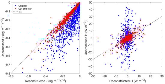 In the realm of practical applications, if the precise turbulent fluxes within a short time span are needed, they can be addressed through the application of the Hilbert–Huang transform. The algorithm shown in Figure 3 and Section 5.2 facilitates the elimination of non-turbulent motions with the aid of fractal dimensions, thereby enabling the computation of turbulent momentum and sensible heat fluxes. Figure 13 shows the comparison of the reconstructed fluxes and the unprocessed fluxes, which suggests that the reconstruction using Hilbert–Huang transform can relieve the overestimation of turbulent fluxes. Moreover, it is viable to summarize the relationship between boundary frequency and standard meteorological parameters; in this way, one can apply the high-pass filter and thereby separate turbulent motions at the boundary frequency in a more convenient way. However, the truncate way of processing the signal will result in the missing of physical components of turbulence, and therefore the effect of correction is less than the Hilbert–Huang transform. The results in this section may pave the way for the convenient correction of multiple turbulent flux samples.