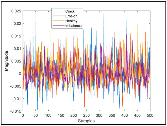 Examples of measured wind turbine blade signals under different conditions at wind speed 1.3 m/s.