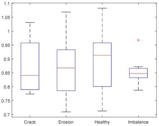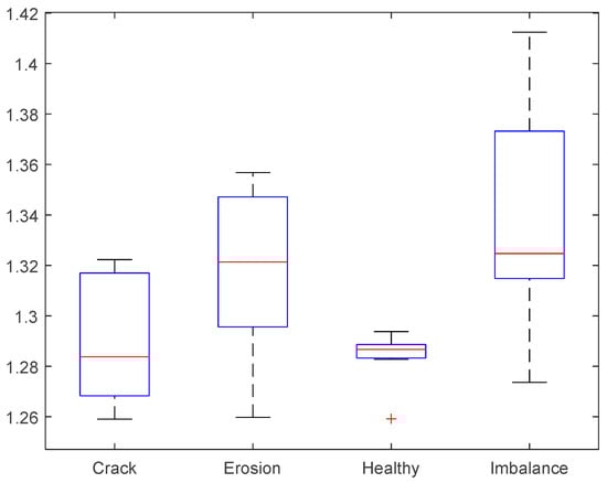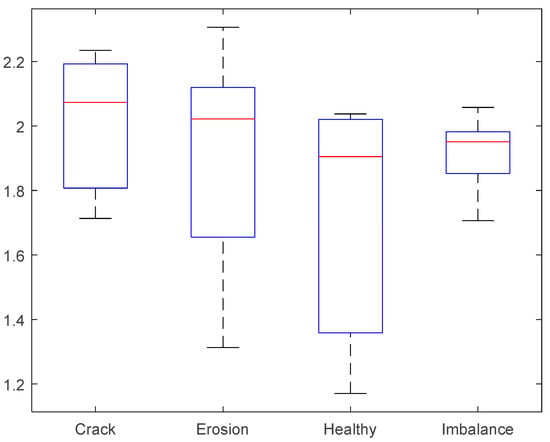 We analyze uniaxial vibration data collected from wind turbines under various operating conditions caused by different wind speeds. Specifically, the vibration measurements are obtained from an induction wind turbine in healthy and faulty states including cracked blades, erosion of the blade surface, and mass imbalance. The vibration measurements are expressed in g (1 g = 9.80665 m/s2). Each file presents unique data collected under various operating conditions and the health status of the wind turbine. There are seven recorded signals from each condition at various wind speeds: 1.3 m/s, 2.3 m/s, 3.2 m/s, 3.7 m/s, 4.5 m/s, and 5 m/s. The data set was obtained from [59]. More details can be found in [59]. Examples of recorded signals from wind turbine blades under different conditions are shown in Figure 1. In addition, Figure 2 exhibits the boxplots of the estimated correlation dimension, Figure 3 exhibits the boxplots of the estimated approximate entropy, and Figure 4 exhibits the boxplots of the estimated Lyapunov exponent.