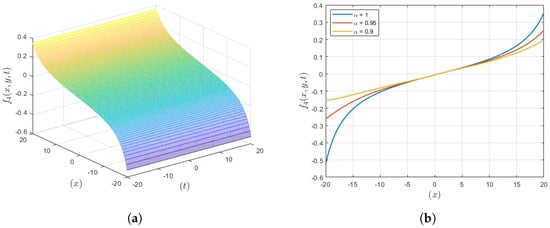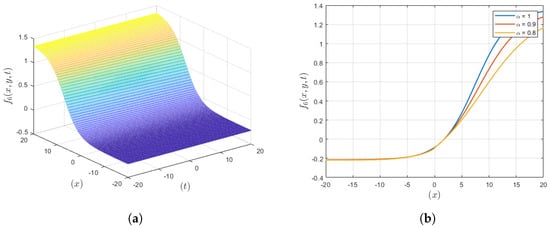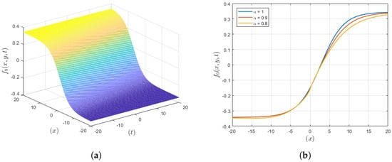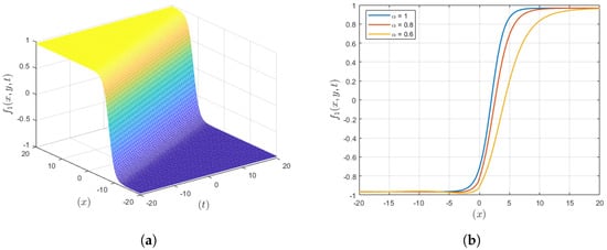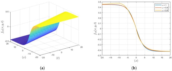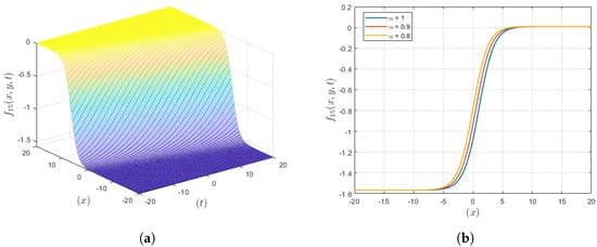 The graphical representation of the anti-kink wave solution () is depicted in Figure 3, where it is revealed that compared to the integer order, the fractional order gives a more localized waveform. If the virtue involves fractional derivatives, then the plot reflects more confined waves, while in case of integer-order derivatives, the plot illustrates less confined structures. This improved localization is useful for applications that demand a specific manipulation of the wave as in the case of drug delivery or optic fiber communications, hence increasing the probability of the accomplishment of the intended goal through the management of waves.