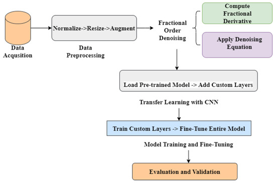 Medical imaging is crucial in diagnosing and treating various health conditions, but the presence of noise in medical images can obscure important details, complicating accurate diagnosis. Traditional denoising techniques often fall short in balancing noise reduction with preserving critical image features [14,17,25,26,27]. To address these challenges, we propose a novel hybrid approach that integrates fractional order denoising with transfer learning. Fractional order techniques offer advanced mathematical methods for precise noise reduction while maintaining image integrity. Unlike traditional integer order calculus, fractional order calculus involves derivatives and integrals of an arbitrary (non-integer) order, allowing for more flexible and accurate modeling of complex systems, including image denoising. Simultaneously, transfer learning utilizes pre-trained convolutional neural networks (CNNs) to leverage existing knowledge from large-scale datasets, enhancing model efficiency and performance in specific applications. By reusing these pre-trained models, our approach can quickly adapt to the task of medical image denoising with improved accuracy and reduced training time. Our Efficient Fractional Order Denoising (EFOD) model is evaluated using several state-of-the-art pre-trained CNN architectures, including DenseNet121, VGG16, ResNet50, and Inception V3. Each model’s performance is meticulously assessed through comprehensive experiments, ensuring robustness and reliability. We address key research gaps such as incomplete dataset utilization, inadequate validation methods, and biased classification by employing diverse datasets, extensive 10-fold cross-validation, and thorough performance analysis.
