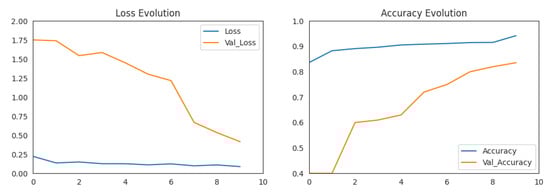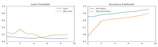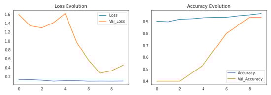 Loss evolution and accuracy evolution for the pneumonia dataset.