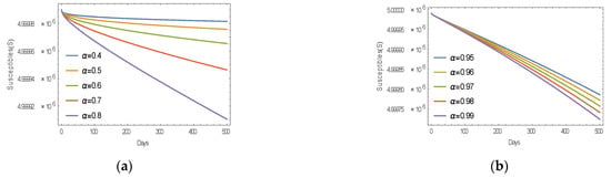 Graph depicting approximate solutions of S(t) part (a) displays results for distinct values of α, while part (b) shows results for larger values of α approaching 1.