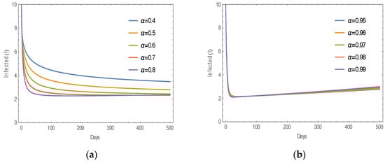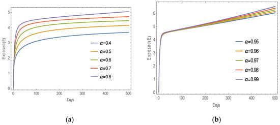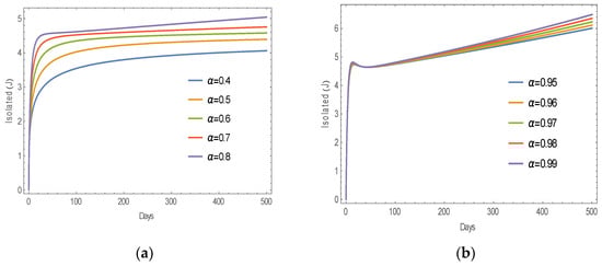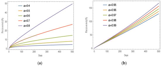 Comparisons among the numerical results are introduced in Table 2, Table 3, Table 4, Table 5 and Table 6, with , which show that the numerical results of the MVM and ITM are very similar. This helps us see how MERS has evolved as a behavior. The arbitrary-order MERS model offers greater flexibility, as demonstrated by the behavior of the solutions for susceptible , exposed , infected , isolated , and recovered over time . This is illustrated in Figure 1, Figure 2, Figure 3, Figure 4 and Figure 5: part (a) shows distinct values of , while part (b) depicts larger values of approaching 1. Furthermore, we deduced from these plots that the outcome of the model under consideration is contingent upon its past performance as well as the parameters specified in the system (10). A comparison of the plots shows that the functions produced from both forms of derivatives behave consistently, even though the resultant values are different. The simulation of the numerical solution for infected I(t) is slower with time, as shown in Figure 2. Based on the results obtained, it can be observed that the proposed scheme facilitates the understanding of behavior using fractional derivatives.