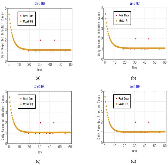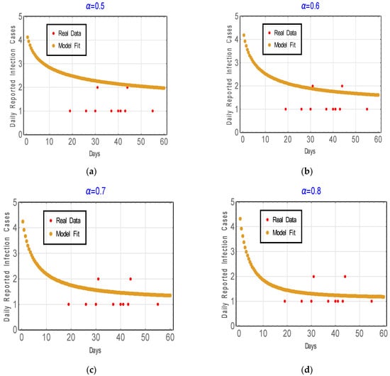 We utilized real data from Riyadh, Saudi Arabia, in 2015 with laboratory-confirmed cases of MERS infection, as detailed in Table 7 []. A comparison of reported MERS cases with model fittings is presented in Figure 6 and Figure 7. These figures show an excellent match with the real data. Our findings suggest that fractional-order models provide a variety of fitting data compared to traditional integer-order models.