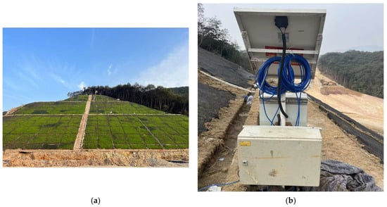 To ensure the safety and stability of the slope post-excavation, an automatic monitoring system has been installed. This system monitors surface displacements of the slope at a frequency of once every 8 h to collect data, as depicted in Figure 1b.